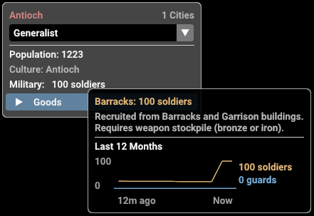 Trade is pure barter. A mountain city with copper surplus but poor soil must find a farm city that needs metal. Geography creates specialization pressure, and isolated cities stagnate. Food decays over time, animals are living populations that hunters can deplete, and forests grow and shrink dynamically.