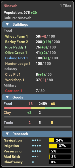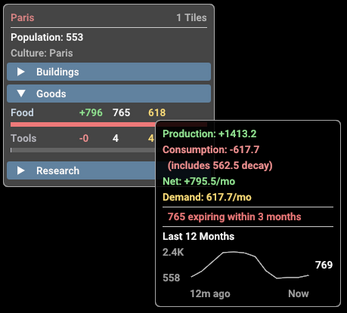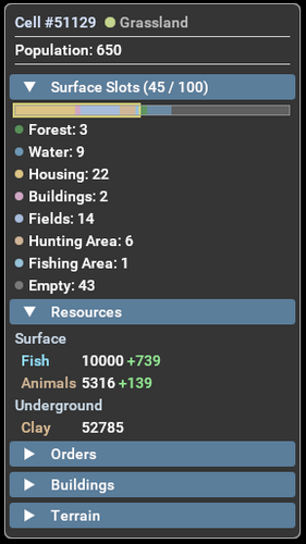 Every tile has 100 surface slots shared between housing, buildings, and natural resources. This zero-sum competition is the foundation of all city growth. More farms means less housing, more housing means more people who need more food. As cities fill up, efficient food sources mathematically squeeze out less productive ones, creating an emergent agricultural revolution with no scripted events.