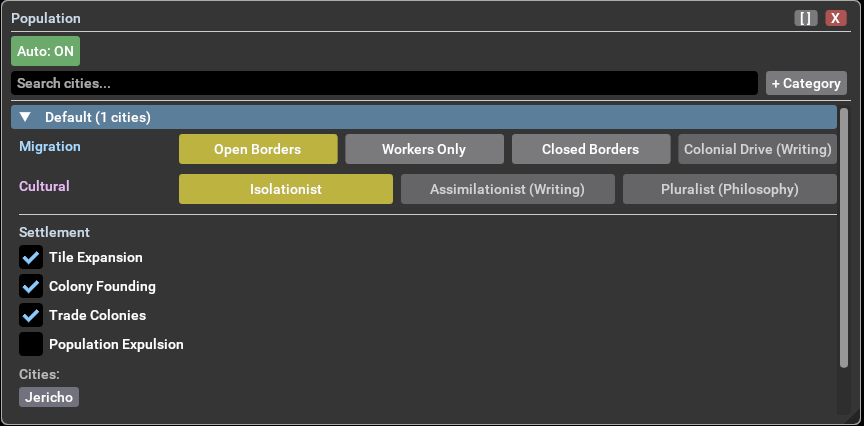 You influence rather than command. Set employment weights to prioritize food, mining, or military. Configure automation presets for groups of cities so you don't have to micromanage hundreds of them individually. Set trade policies and food conservation levels per city category. The system redistributes workers gradually based on your priorities and local conditions.