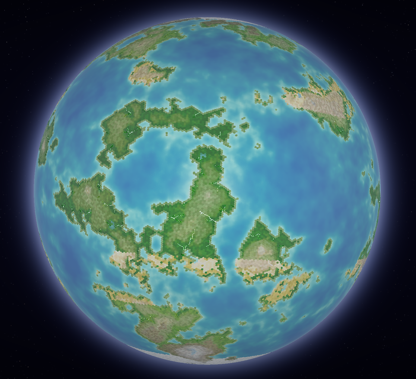 - 163,842 hex tiles on a procedural icosphere planet (configurable 82K to 1.3M)